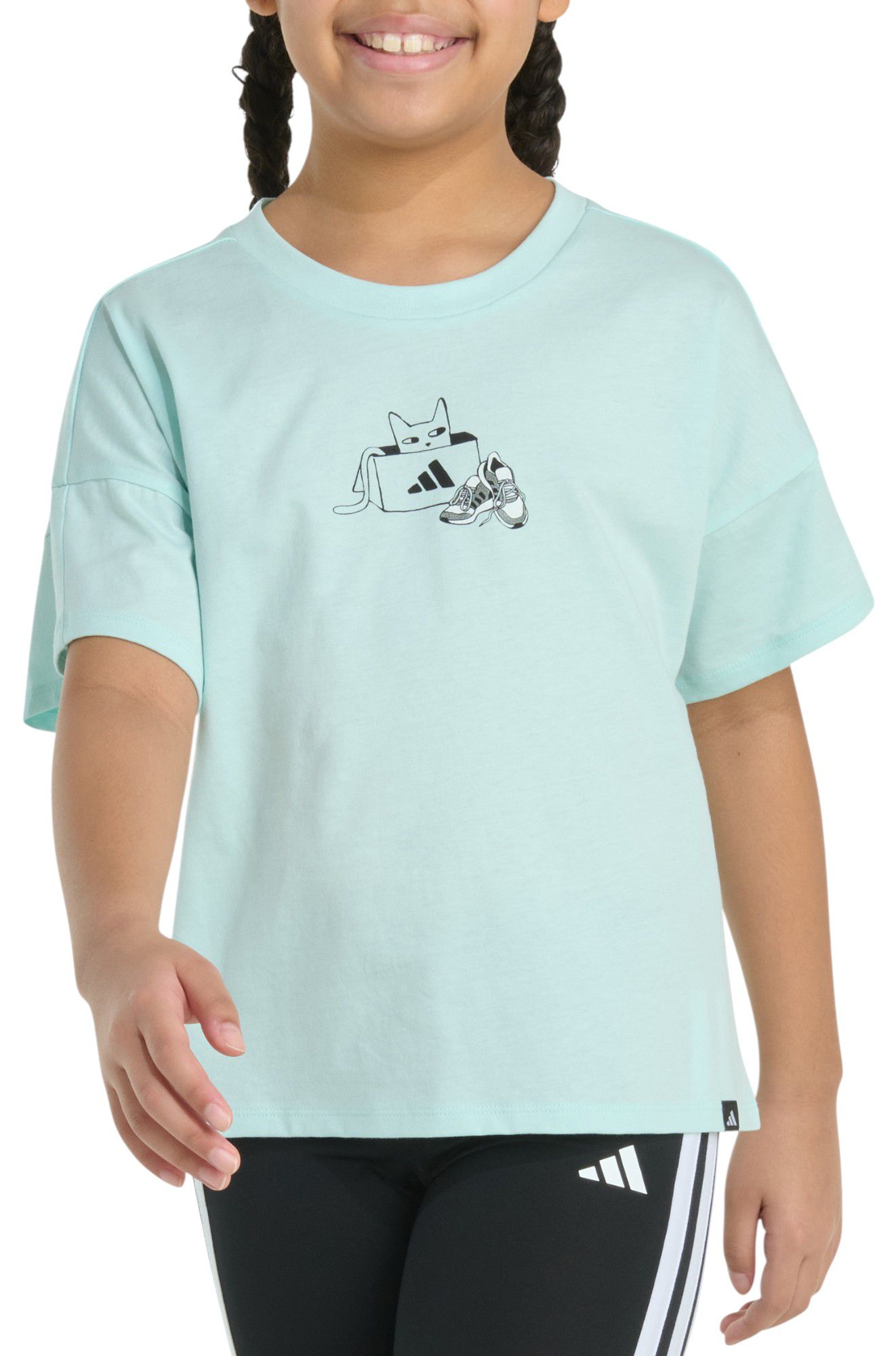 Graphic tees are an easy way to add self-expression to an outfit. This girls' adidas t-shirt is a prime example, with fun graphics on the soft cotton fabric. Drop shoulders and a loose cut give it extra style points — and comfort points, too.