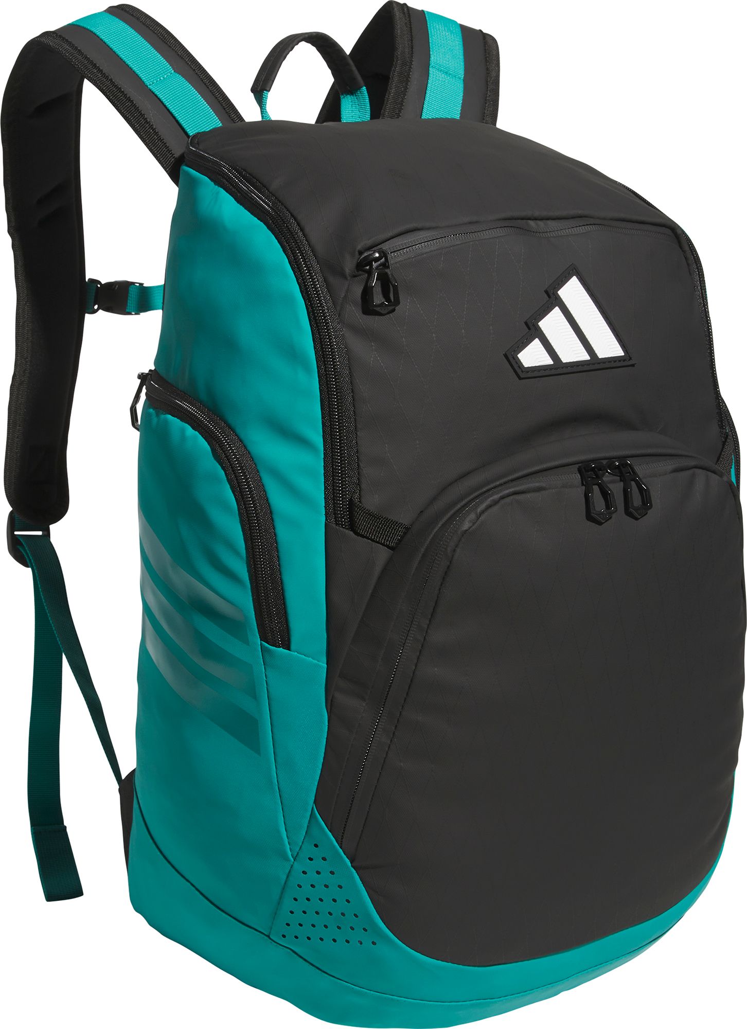 Perfect for team sports, the adidas Select Backpack uses water-resistant material to keep gear and clothing dry. Its multiple storage areas include a ventilated zip pocket for used gear and a padded sleeve for your laptop. There are hydration pockets, a trolley strap and a sternum strap for distributing weight.