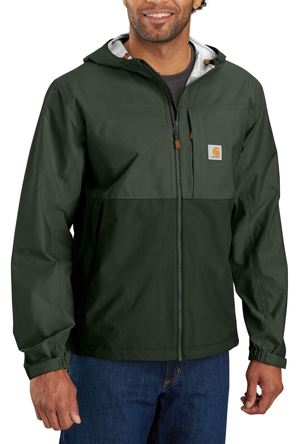 Stay dry and comfortable on your next hike with the Carhartt Men's Packable Lightweight Storm Defender Jacket. Designed with a standard fit and room for layering, this jacket features a full-zip construction and a hood with an inner drawcord for adjustable coverage. Lightweight and packable, it's easy to store and perfect for tackling unpredictable weather while keeping your essentials secure in its multiple zip pockets.