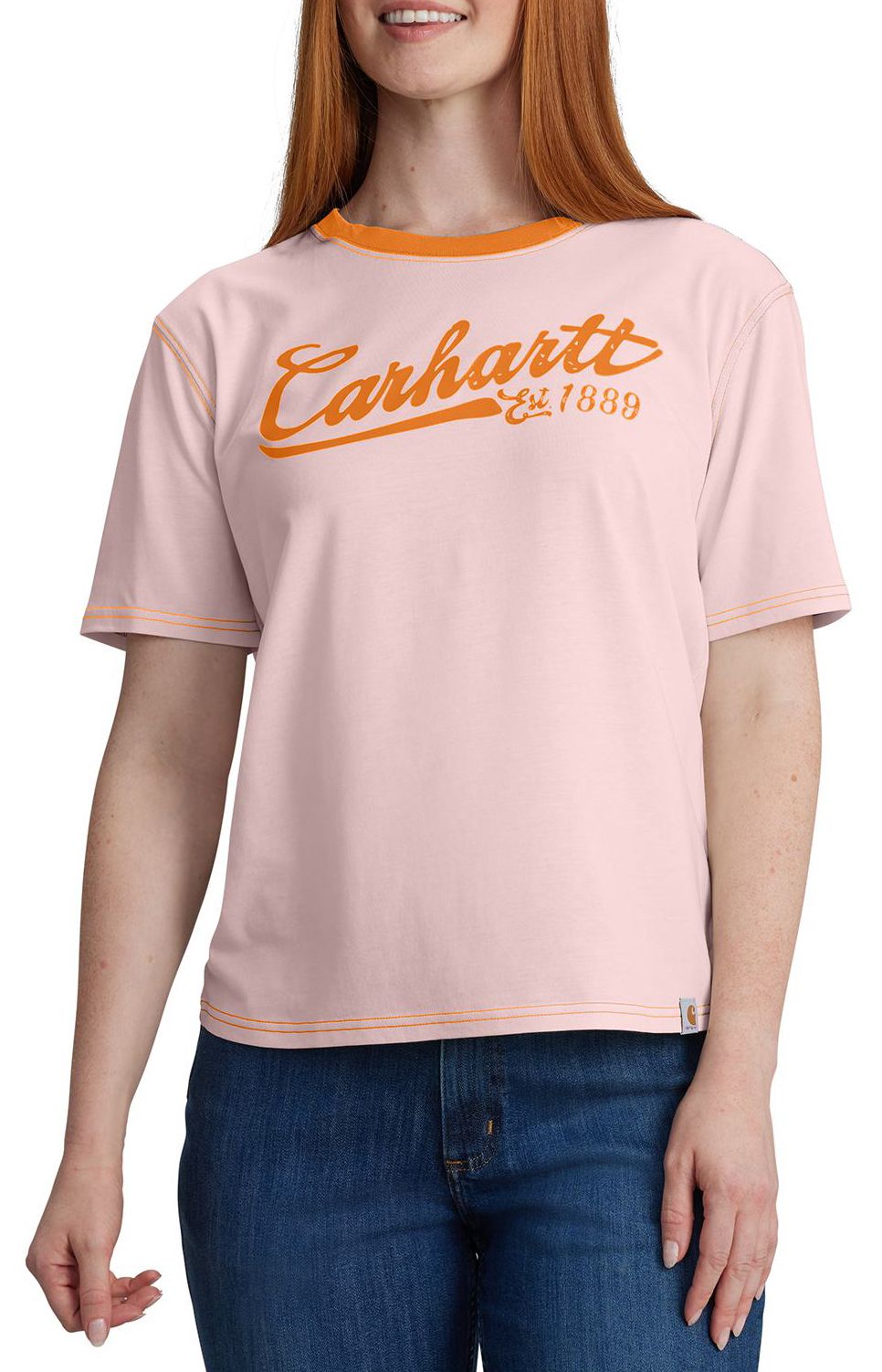 Stay comfortable and stylish in the Carhartt Women's TENCEL™ Fiber Ringer Short Sleeve Graphic Tee. This lightweight, loose-fitting shirt features TENCEL™ Lyocell fibers derived from sustainable wood sources and a rib-knit crewneck that holds its shape throughout the day. With a classic Carhartt graphic on the chest and a tagless neck label for added comfort, this tee is perfect for any casual outing.