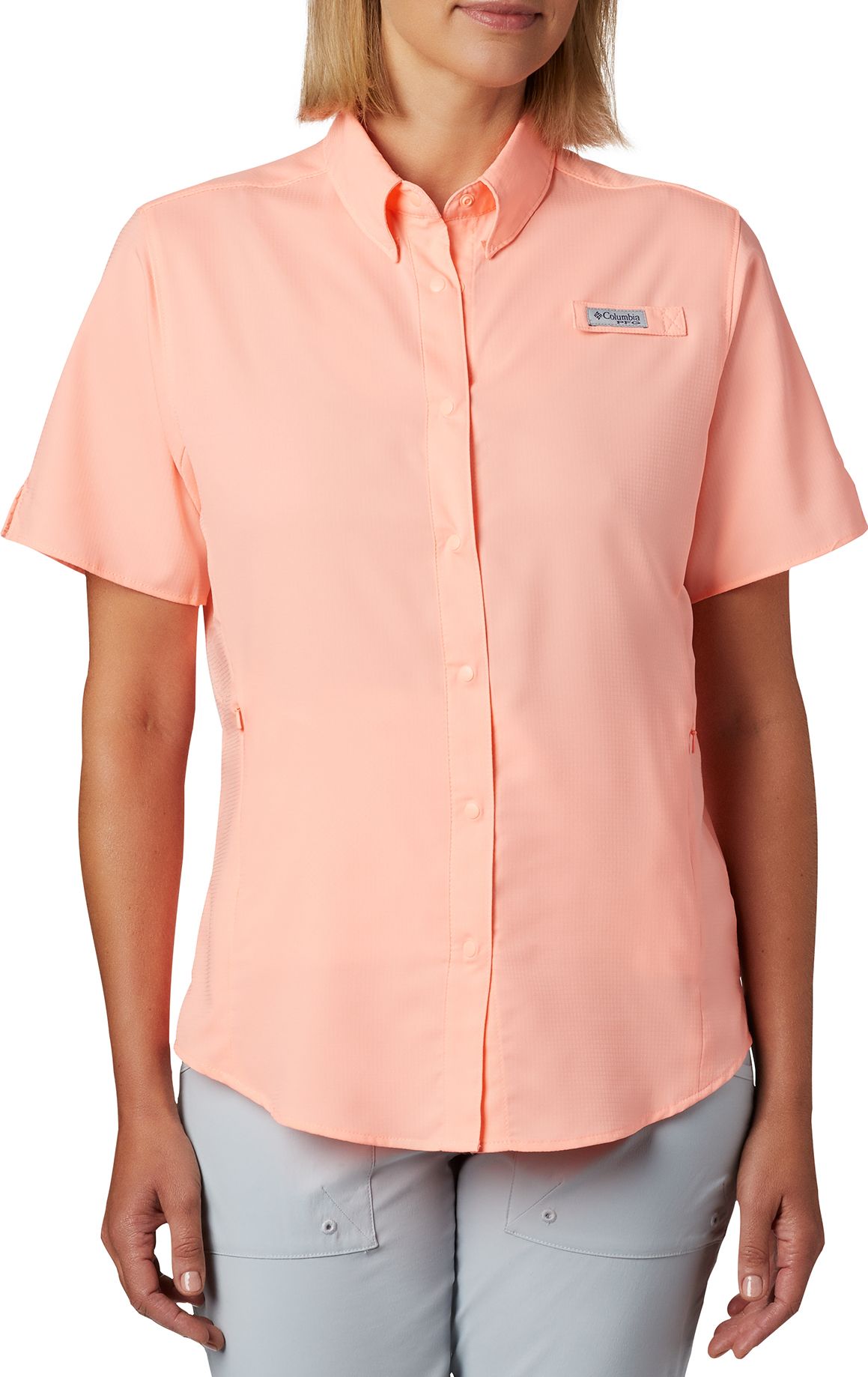 Designed for the female angler, the Columbia® Women’s PFG Tamiami™ II Shirt is built for mobility and comfort during any activity. Its lightweight design is ideal for warm days and the Omni-Shade™ technology provides outstanding UPF 40 sun protection. The mesh-lined vents add breathability and the convenient, zippered security pockets allow you to keep small gear within reach.