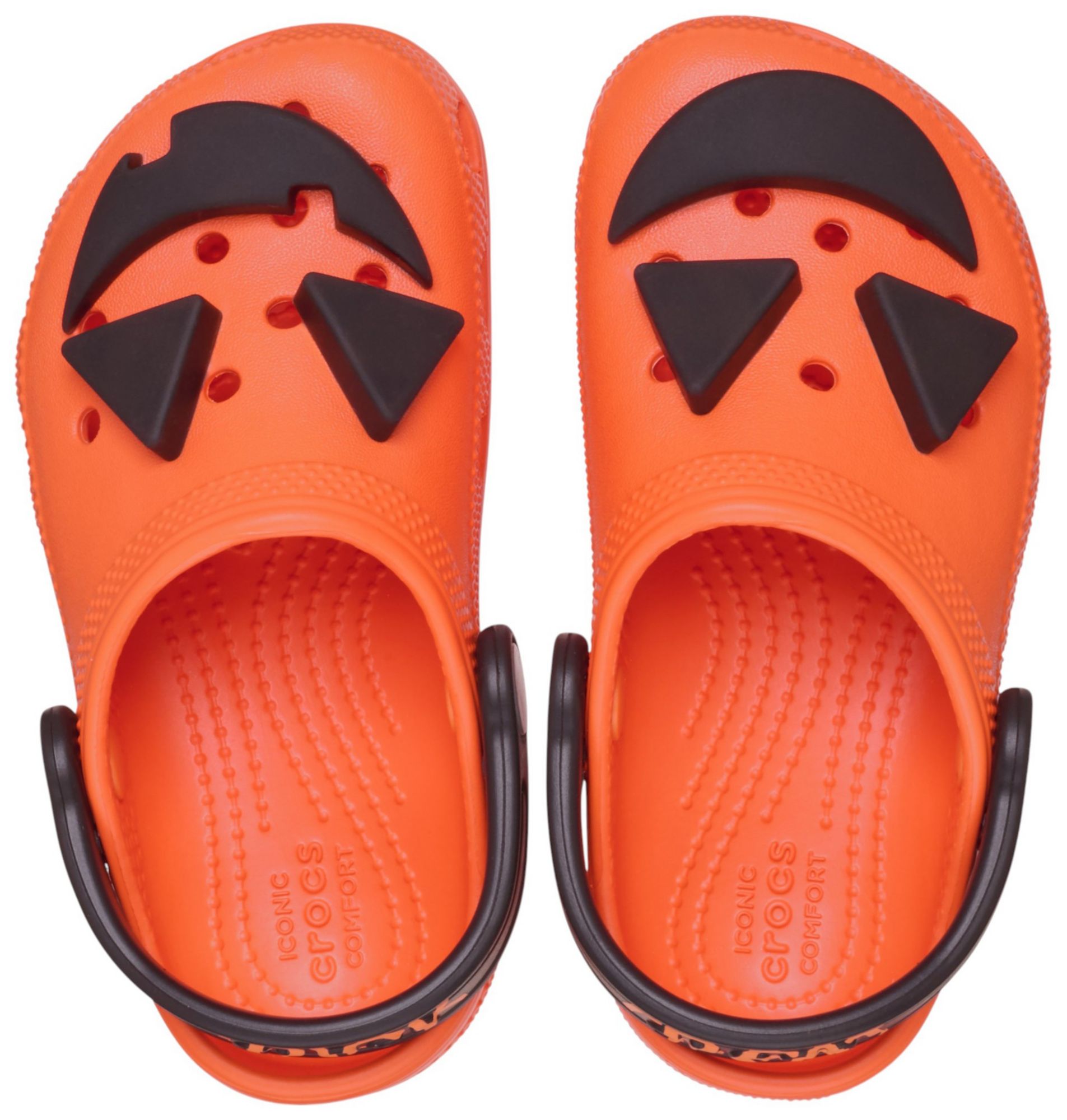 Trick or treat! This version of the iconic clog features a fun Jack O’ Lantern face that lights up with every step. Plus, ‘Trick’ is printed on the left heel strap and ‘Treat’ is printed on the right heel strap. Kids will enjoy the fun Halloween theme, and Croslite™ foam construction keeps the clogs comfortable and easy to wear. Crocs offers a variety of Classic Clogs for Kids and Toddlers that feature inspired designs to help kids express themselves and engage new friends, resulting in more fun.
