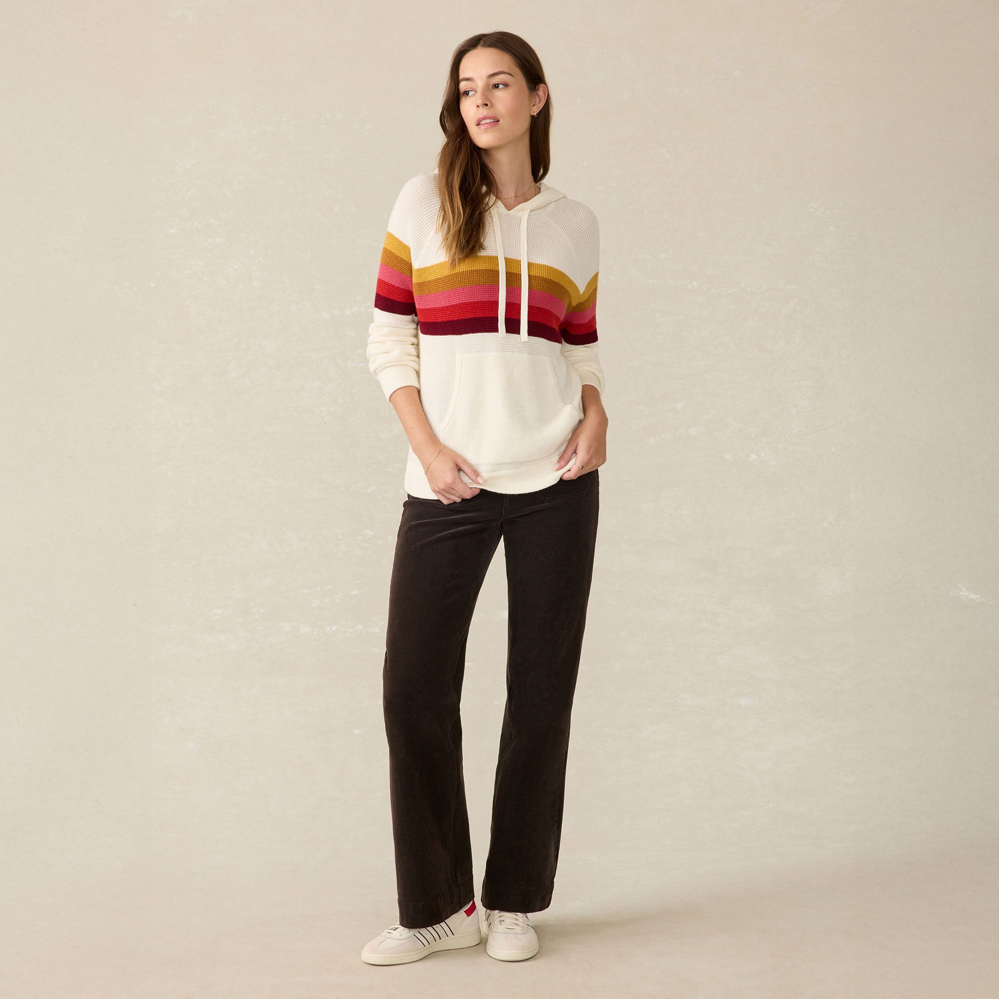 With a nod to nostalgic collegiate sportswear, this casual-cool hoodie gets an elevated update in the softest organic cotton and cashmere yarn. The wonderfully textured waffle stitch lays with a relaxed, no-fuss fit that keeps you toasty and comfy. Play up the sporty stripes and playful color blocking with jeans or a corduroy skirt for a quintessential fall look.