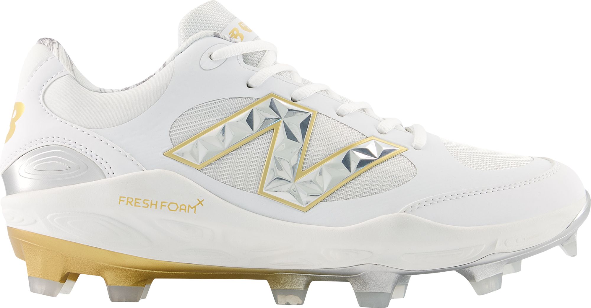 Engineered for a champion, the 3000v7 TPU cleat delivers exceptional performance on natural or synthetic surfaces. Colors are inspired by the gleaming gold and dazzling diamonds of a championship ring, capturing the spirit of triumph and the joy of a celebratory dogpile.