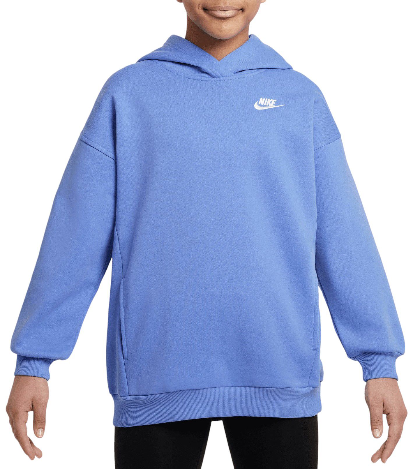 Wrap your young athlete in cozy comfort with the Nike Girls’ Sportswear Oversized Club Fleece Pullover Hoodie. This hoodie boasts a spacious and relaxed fit, featuring dropped shoulders and a smooth exterior with a brushed interior for ultimate softness. With its lightweight fleece, front pockets, and embroidered Futura logo, it's the perfect layer for extra warmth and effortless style.